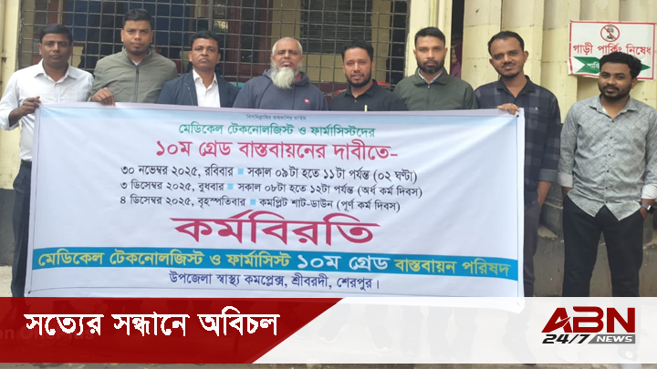 দশম গ্রেড বাস্তবায়নের দাবিতে সারা দেশের কেন্দ্র ঘোষিত কর্মসূচির অংশ হিসেবে শেরপুরের শ্রীবরদীতে মেডিকেল টেকনোলজিস্ট ও ফার্মাসিস্টরা দুই ঘণ্টা কর্মবিরতি