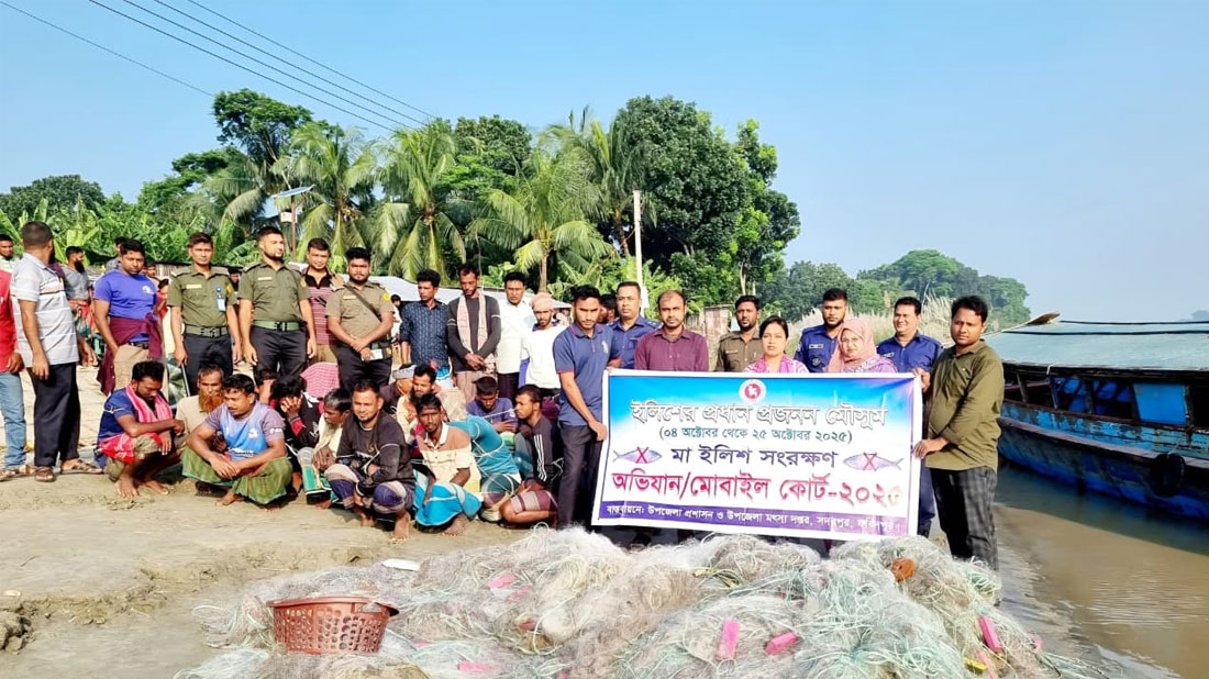 ফরিদপুরের সদরপুর উপজেলায় পদ্মা নদীতে প্রজনন মৌসুমে মা ইলিশ ধরার সময় ৫০ হাজার মিটার কারেন্ট জাল, ২০ কেজি ইলিশ জব্দসহ