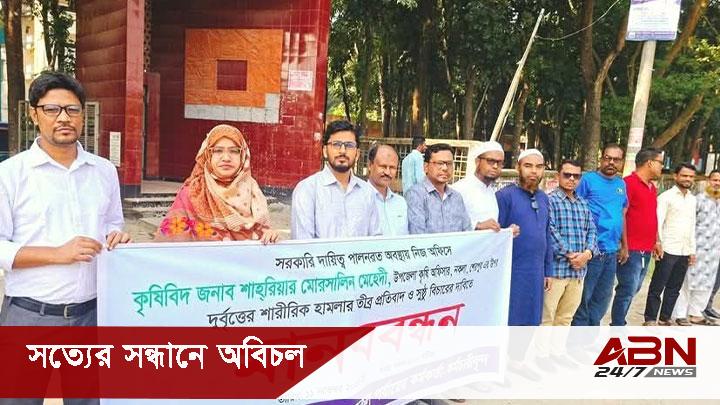 শেরপুরের নকলা উপজেলা কৃষি কর্মকর্তা শাহরিয়ার মোস্তাফিজ মেহেদীর ওপর নিজ কার্যালয়ে দুর্বৃত্তদের হামলার প্রতিবাদে জামালপুরের বকশীগঞ্জে মানববন্ধন কর্মসূচি পালন করা