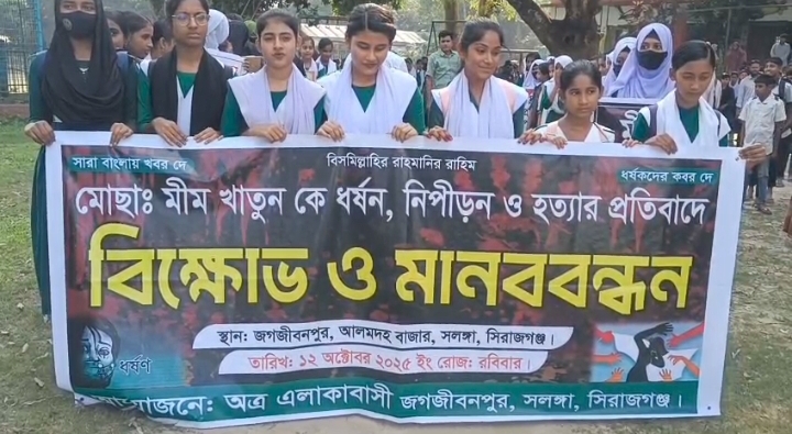সলঙ্গায় ছাত্রী ধর্ষণের প্রতিবাদ ও ধর্ষকের ফাঁসির দাবিতে মানববন্ধন